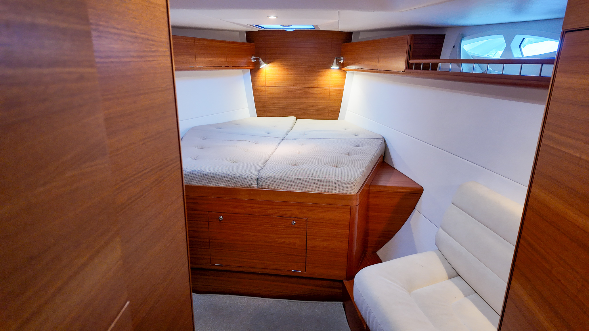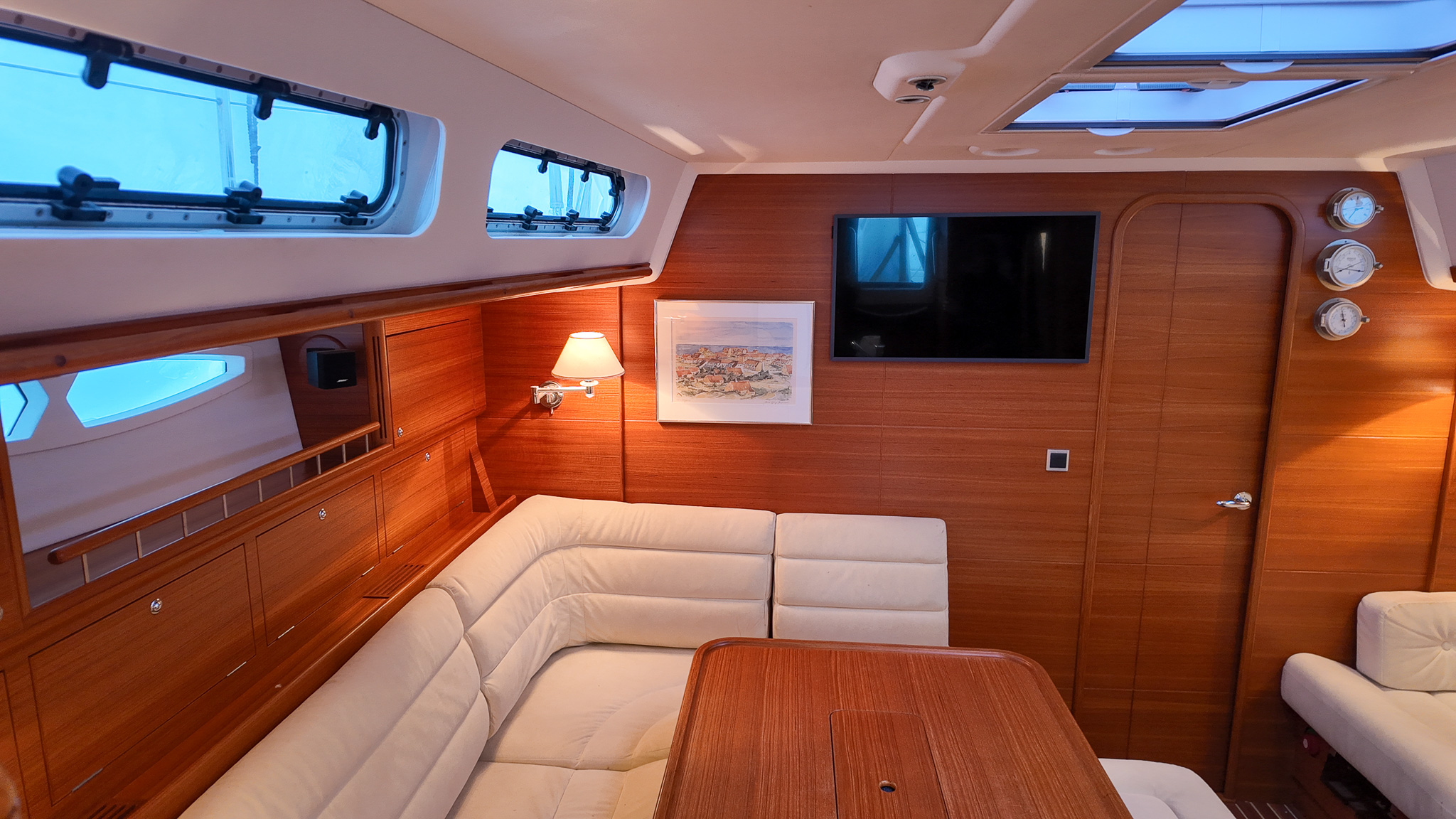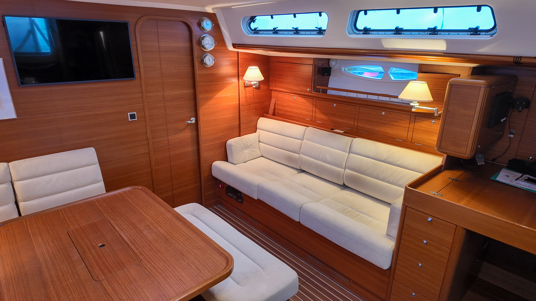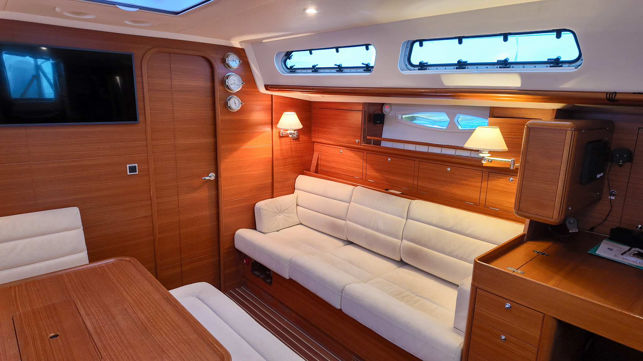 Interiören i Xc 45 är en studie i skandinavisk design där högkvalitativ teak möter moderna och ljusa ytor. Salongen är rymlig och inbjudande med en layout som är optimerad för både socialt umgänge och praktisk funktion under gång. Det välutrustade u-pentryt ger kocken optimalt stöd vid sjögång, medan det stora navigationsbordet påminner om båtens sanna syfte som en seriös långseglare. Varje kabin är utformad med fokus på maximal förvaring och högsta boendekomfort, vilket gör livet ombord behagligt även under längre vistelser i hamn eller till havs.